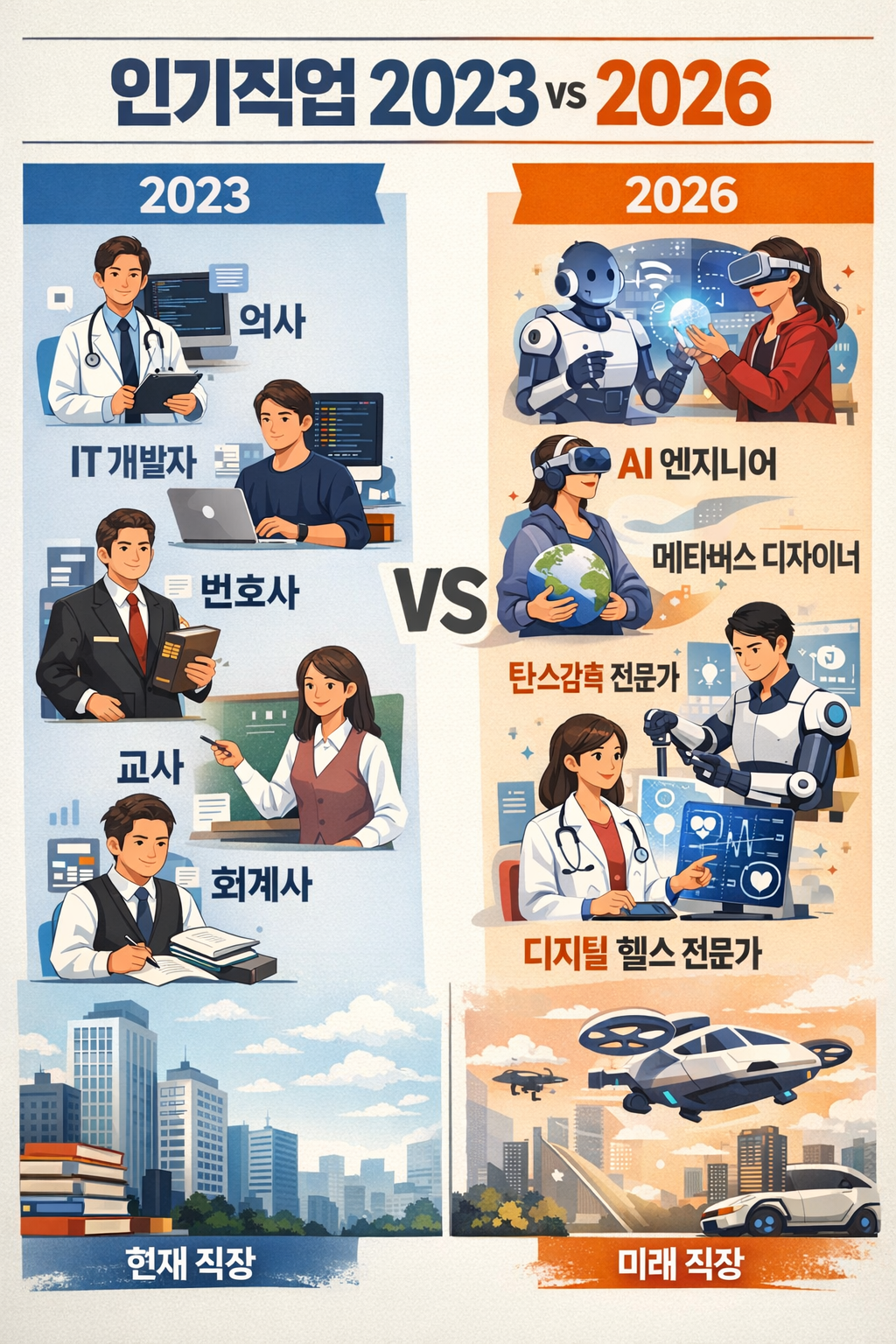 최근 몇 년 사이, 우리가 일하고 살아가는 방식은 눈에 띄게 바뀌고 있습니다. 특히 2023년부터 2026년까지의 짧은 기간 동안에도, 직업 시장에는 크고 작은 변화가 쉴 새 없이 일어나고 있죠. 기술의 발전, 사회의 요구, 그리고 환경 문제에 대한 인식 변화는 우리가 생각하던 ‘일자리’의 개념 자체를 흔들고 있습니다. 이 글에서는 2023년에 인기를 끌었던 직업들과 2026년 현재 가장 주목받는 직업들을 비교하며, IT, 환경, 헬스케어 산업의 변화를 중심으로 미래 직업의 흐름을 짚어보려 합니다.